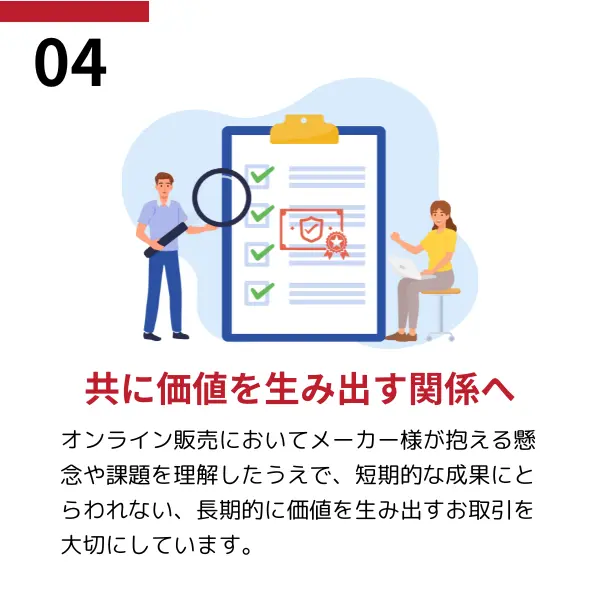 長期的なお取引を前提に、メーカー様の方針や商品特性を尊重した販売・運用を心がけています。
